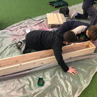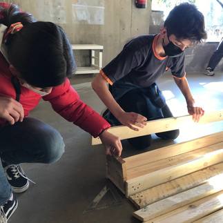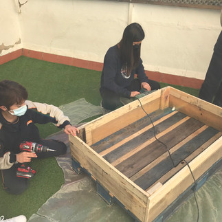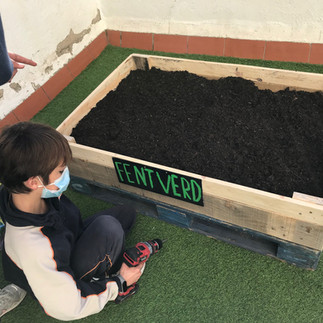 Alumnat de 1r ESO va preparar els dies anteriors tot el material que feia falta per poder construir un hort urbà, una jardinera i una caixa per fer compostatge. Tot el material que han fet servir han estat palets de fusta reutilitzats que cedeix Envialia al Projecte Fent Verd.